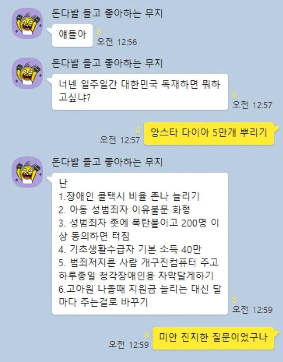 너넨 일주일간 대한민국 독재하면 뭐하고싶냐?